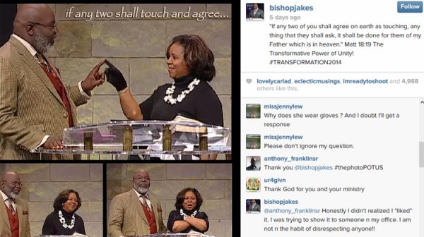 Apparently, Jakes didn’t take too kindly to his fellow social networker’s post beneath a photograph of his wife of more than 30 years wearing black gloves with her outfit.